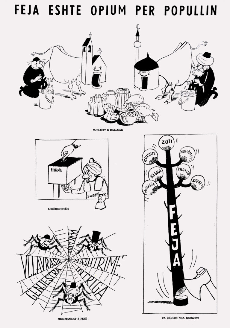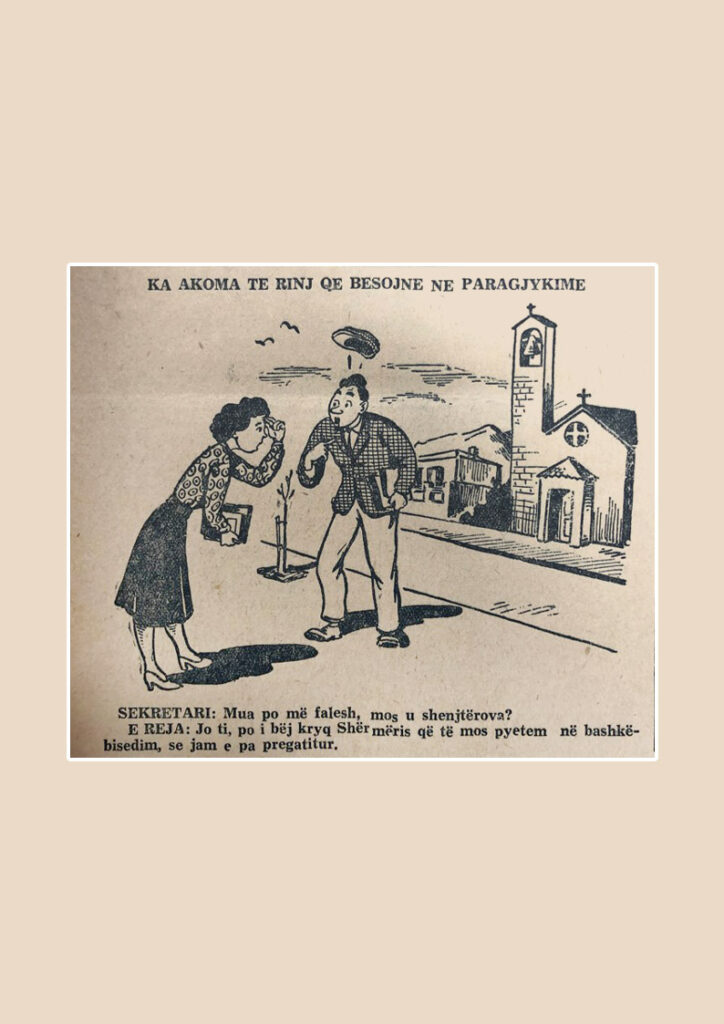 Through a selection of illustrations published in daily and periodical press, this exhibition presents a perspective on the function, use, and communication of both antireligious and sacralizing graphics produced by the Albanian communist regime during the three decades spanning from the sanctioning of secularism (1946) to state atheism (1976). The common denominator of this visual production is the creation of religious “masks,” primarily through parody and caricature, and the standardization of a collective perception shaped by the messages of visual semantics. Constant circulation in the press and in the pedagogy of mass organizations, the monopoly of discourse, and the simplicity and directness of the message made it possible for these masks to transform into iconic images, so much so that they continued to dominate interpretive categories even after the fall of the regime. From a thematic point of view, the illustrations highlight two distinct phases that emerge in the early 1960s. The first, coinciding with the implementation of secularizing policies and strategies of mass control, is characterized by graphics denouncing religious practices, authorities, and traditions. In the second phase, when militant atheism was activated as an antireligious tool, religion itself became the preferred target, at the very moment when power sought to invest in controlling the individual. As a result, all the earlier “masks”, perversion, violence, obscurantism, parasitism, opportunism, ignorance, manipulation, as well as geopolitical and geocultural conflicts came to clearly identify religion, along with its layers of vocabulary, clothing, food, customs, tastes, and, of course, anthroponymy. Since nature admits no void, the public shrinking of traditional religions was compensated by the “isotopes” of socialist order, and the graphics developed dialectically. The content of these illustrations thus goes beyond the antireligious register, accompanied by the regime’s own masks: emancipation, salvation, progress, materialist worldview, science, or the “new man,” all of which opposed metaphysics, triumphed over it, and created a collective language and imagination. Even when absent as concrete images, they manifested through slogans, commentaries, anecdotes, parodies, or elaborations with academic ambition, or simply within the context of the medium, so that the public could easily perceive the embodiment of the Good or the Truth in the authorities of the regime. The function and use of these graphics were also shaped by the relationship between medium and audience. Created as a “satirical sheet” in 1945 by the Ministry of Press, Propaganda, and Popular Culture, the magazine Hosteni distinguished itself for the quality and continuity of its antireligious graphics, though its readership was more individual and filtered. In contrast, Vatra e Kulturës, despite its calibrated print run, disseminated graphics more widely than any other magazine, spreading them into the rural corners of the country. Serving as a propaganda manual within the capillary network of cultural centers, it not only offered scripts but also generated its own audience. Meanwhile, the youth press (Zëri i Rinisë, Pionieri, Fatosi), addressing a generation fully shaped under the regime’s social engineering, projected the message into the future. And it was precisely from this disenchanted generation that the elites emerged who later guided Albania’s transition.